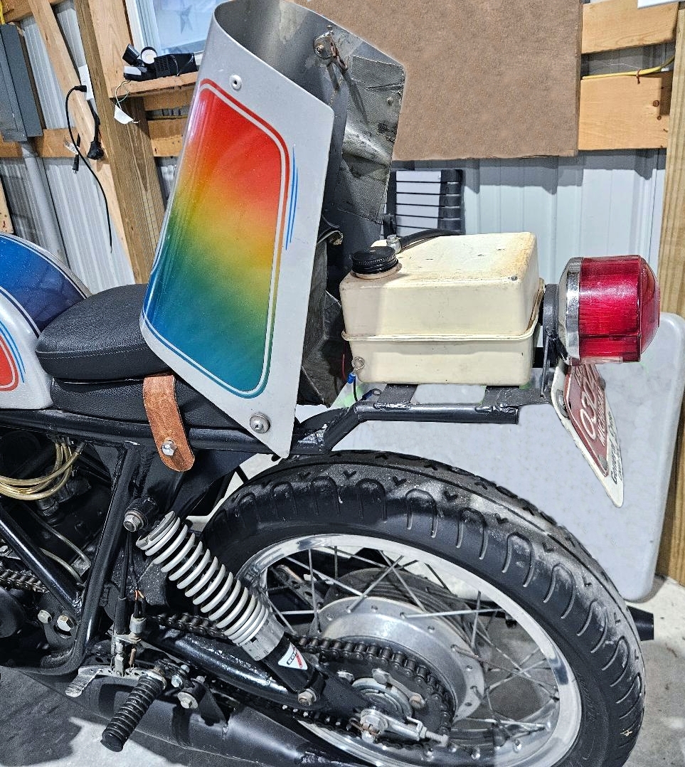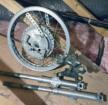 - GT750 Suzuki front forks and dual disc brakes with 18” alloy rim, rotors thinned and drilled (also includes a second set of GT750 forks with the 4 leading shoe drum brake and 19” alloy rim)