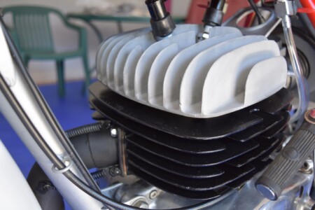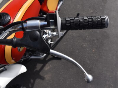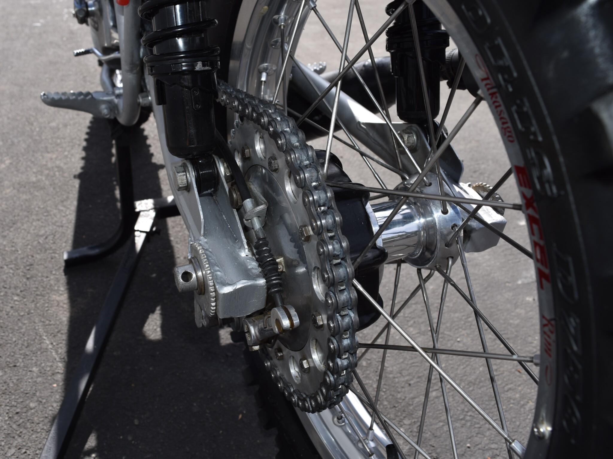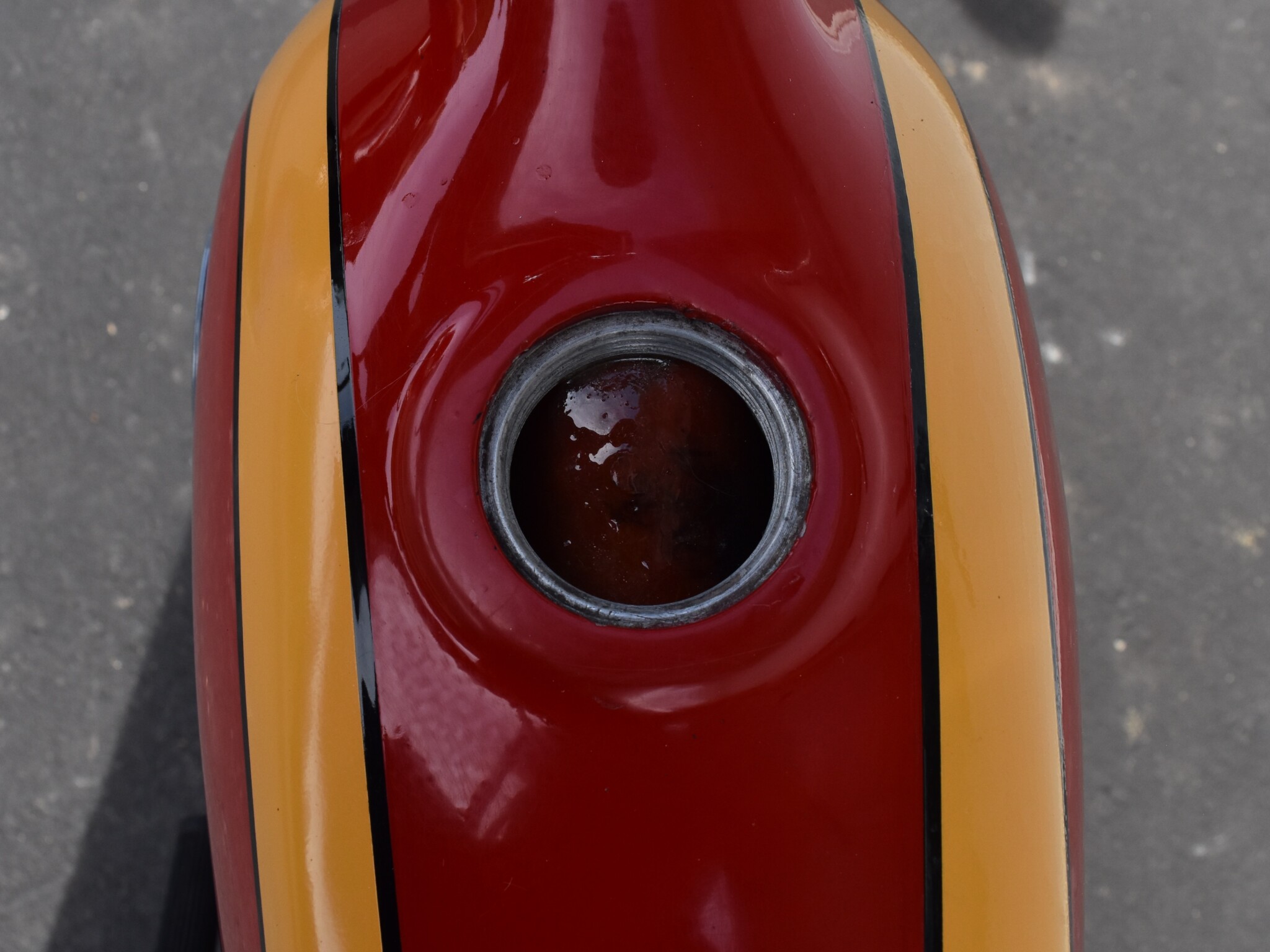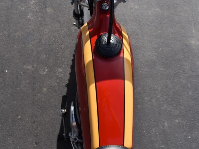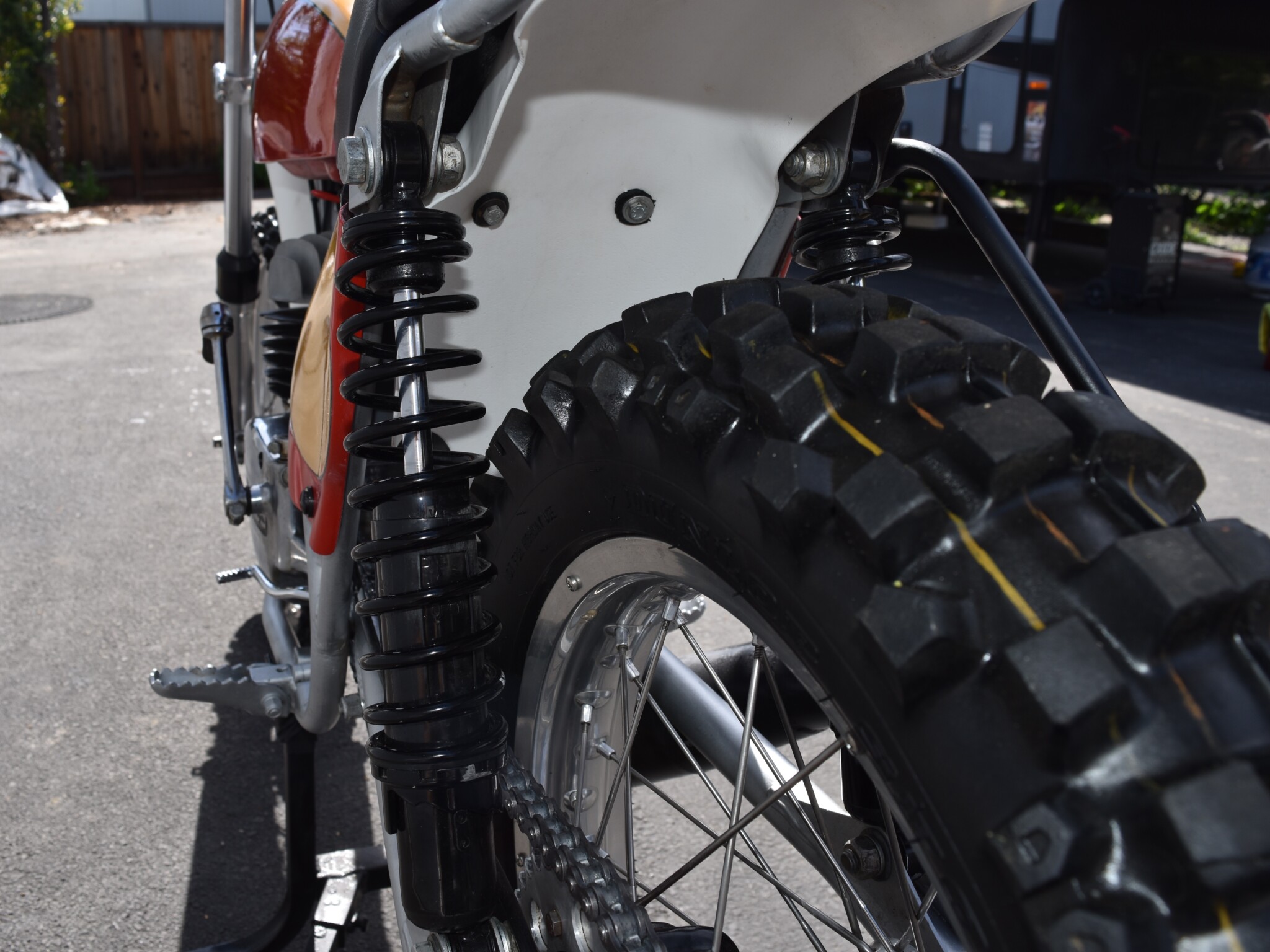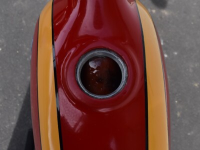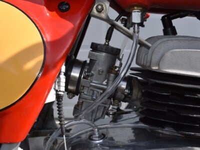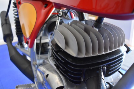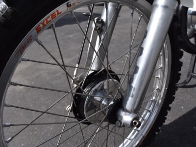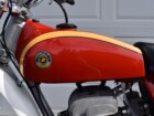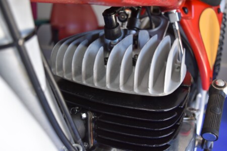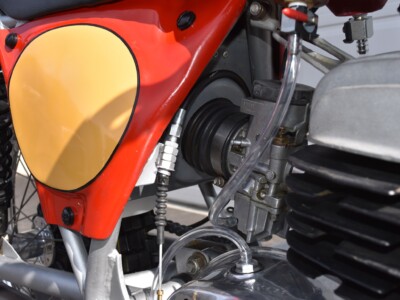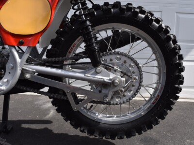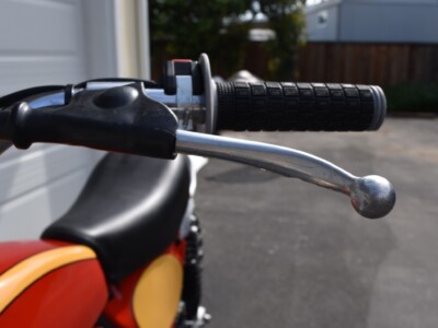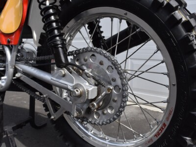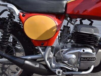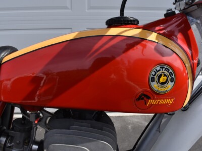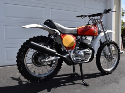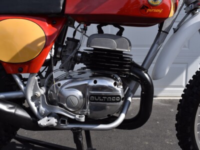 This fully restored, matching numbers 1974 Bultaco Pursang MK7 is finished in factory red with yellow accents and white fenders over a newly painted silver frame and powered by a 360cc two-stroke single connected to a five-speed transmission.  Standard features include a black solo seat, a cross-braced handlebar, an upgraded Amal carburetor, Kickstarter, and wire-spoke wheels.  The fuel tank is newly painted, and the inside of the tank was sealed.  The engine was rebuilt by racer and mechanic Pat Brown.  This restored MK7 is now offered in San Jose, California, for off-road use only with a California title in the seller’s name.