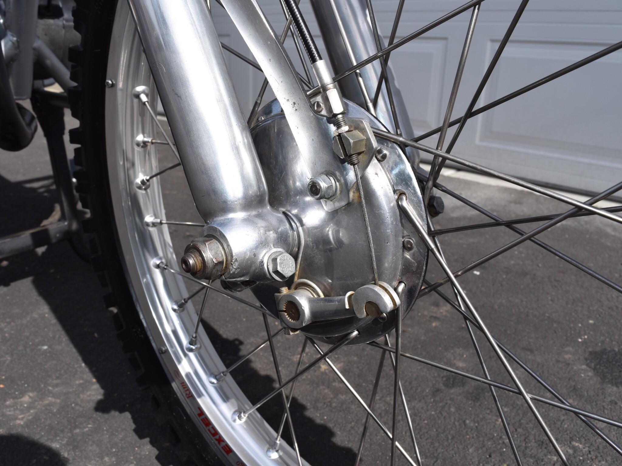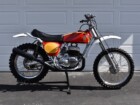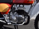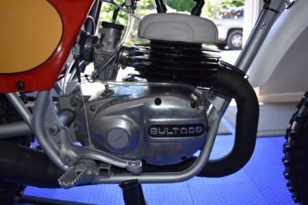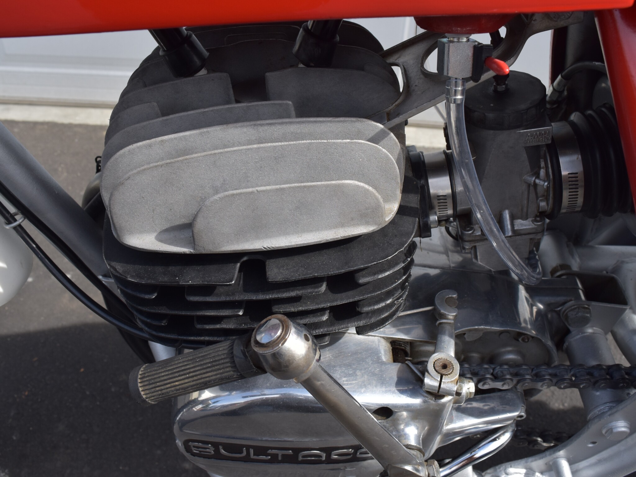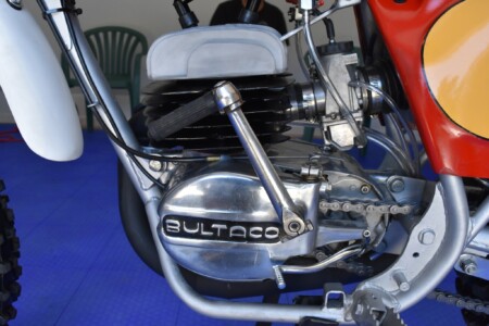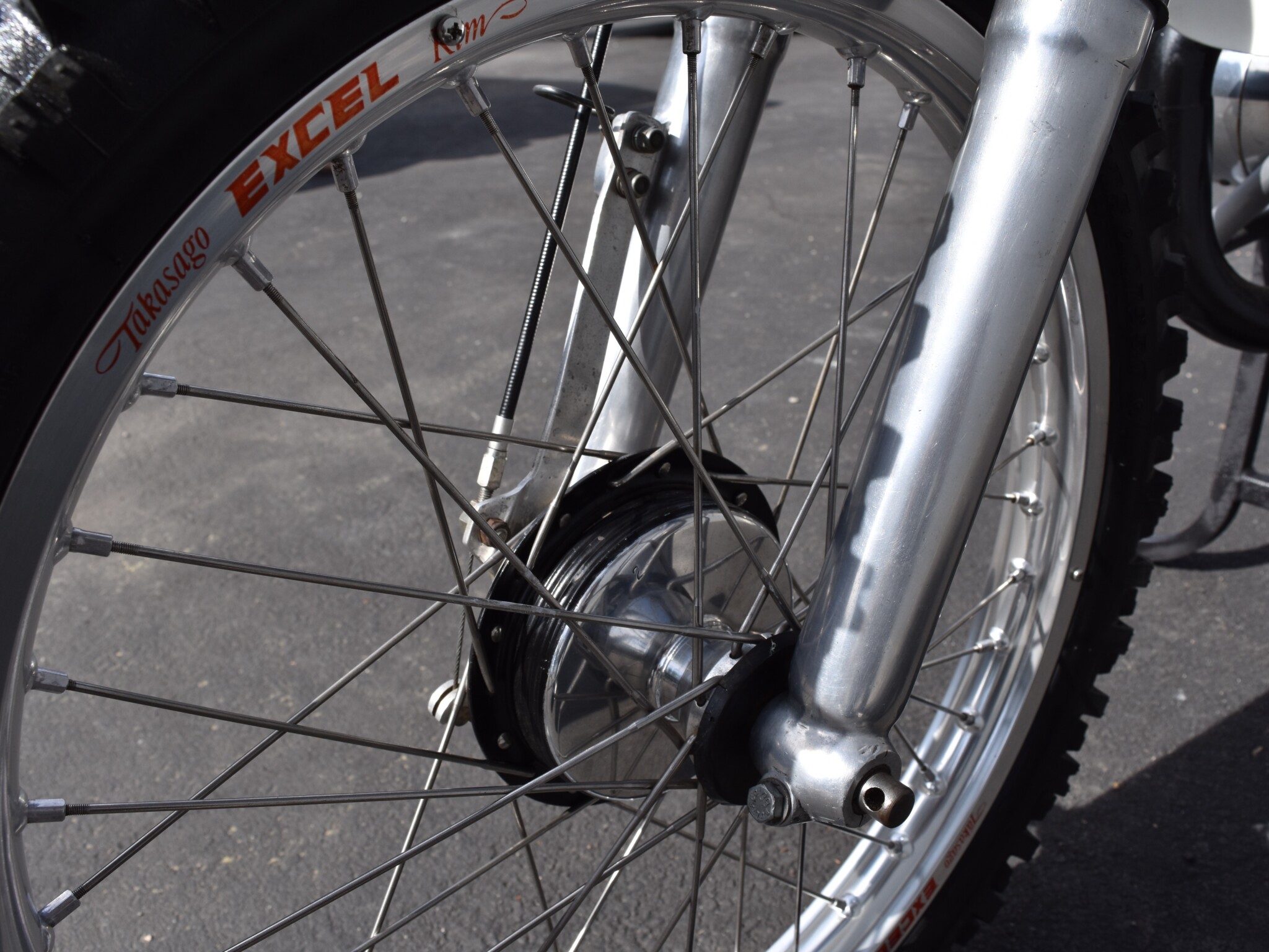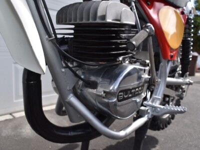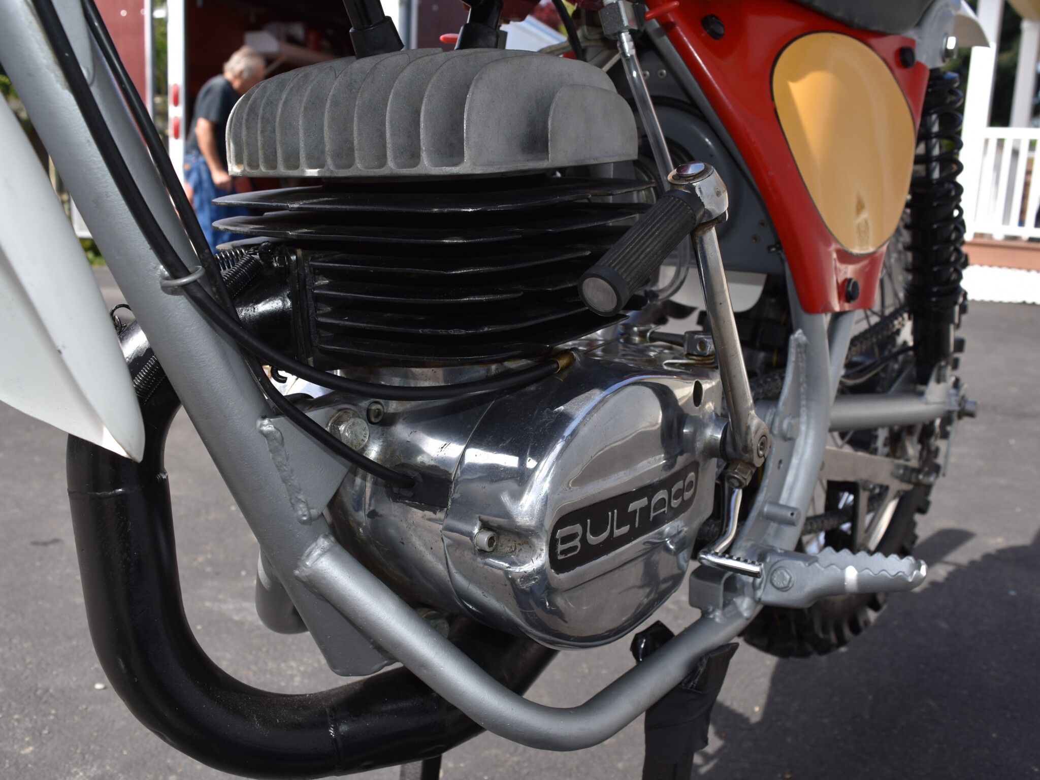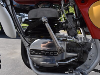 This bike has been beautifully restored with polished cases and polished wheel hubs, and the barrel and the head were restored to new condition.  Takasago Excel rims gleam brightly at the front and rear and are mounted with tires that have minimal use.  The suspension includes Race Tech front fork springs with Gold Valves and dual progressive shocks mounted to the swingarm.  Factory drum brakes are mounted front and rear inside the polished hubs.  The cross-braced handlebars exhibit bright chrome and new grips, and the polished billet aluminum triple tree has a mirror-like shine.  The seller states that he has had about 12 laps, or less than 2 hours of riding time, since the motor was rebuilt.  The 360cc two-stroke is air-cooled with a brand-new electronic ignition system that gets this Bultaco fired up with one kick.  The Amal carburetor is an upgrade from the original factory Amal and delivers improved performance.  The right-side shifter was moved to the left side, and the rear brake is now mounted on the right side.  The bike has been fitted with an FMF exhaust and is said to meet forestry and AHRMA noise and spark requirements.  It comes with a California green sticker for off-road riding.  This bike is ready to race, enjoy off-road, or become a centerpiece in your collection.