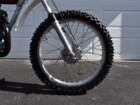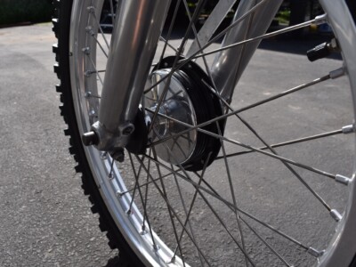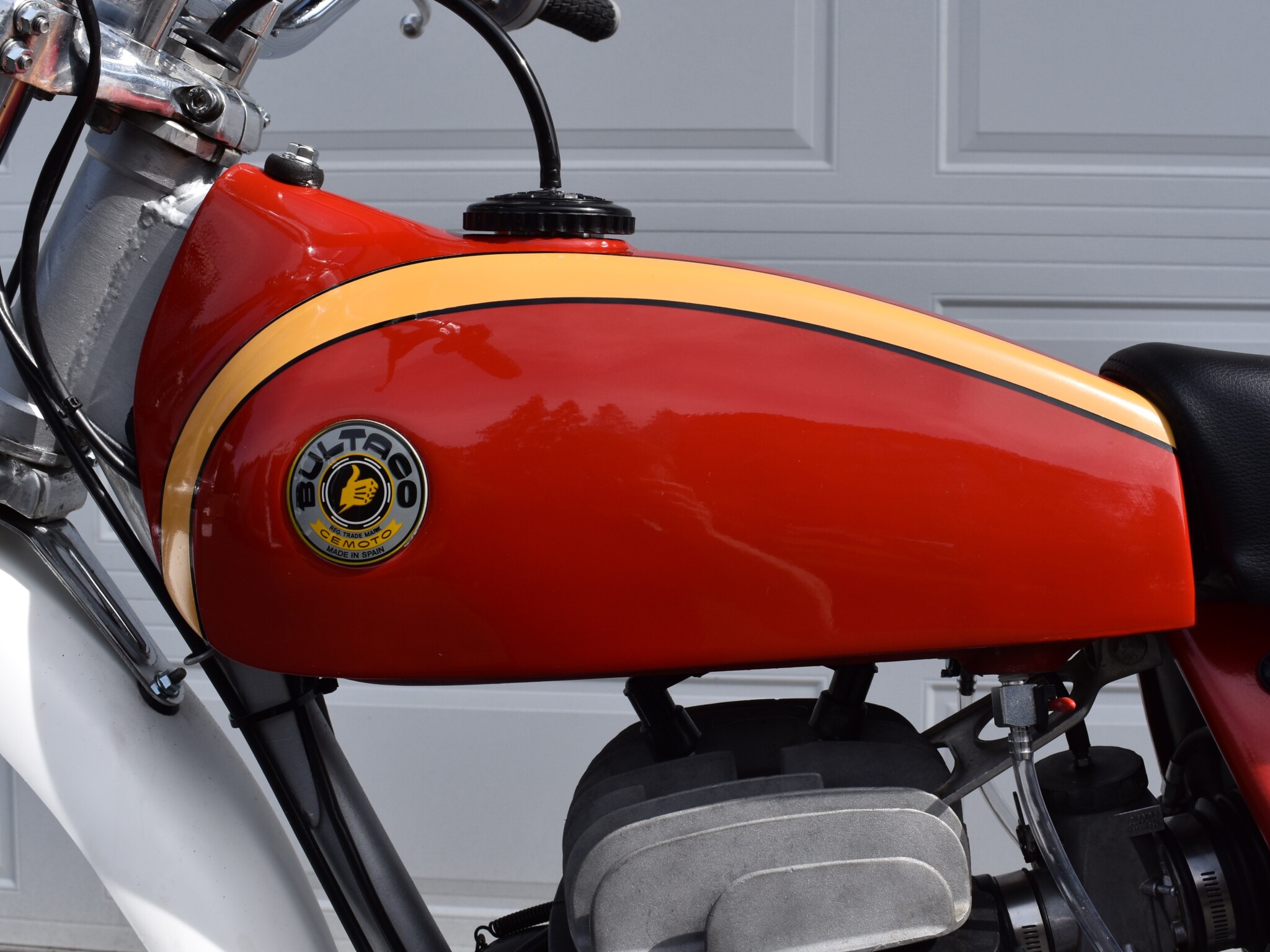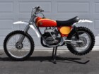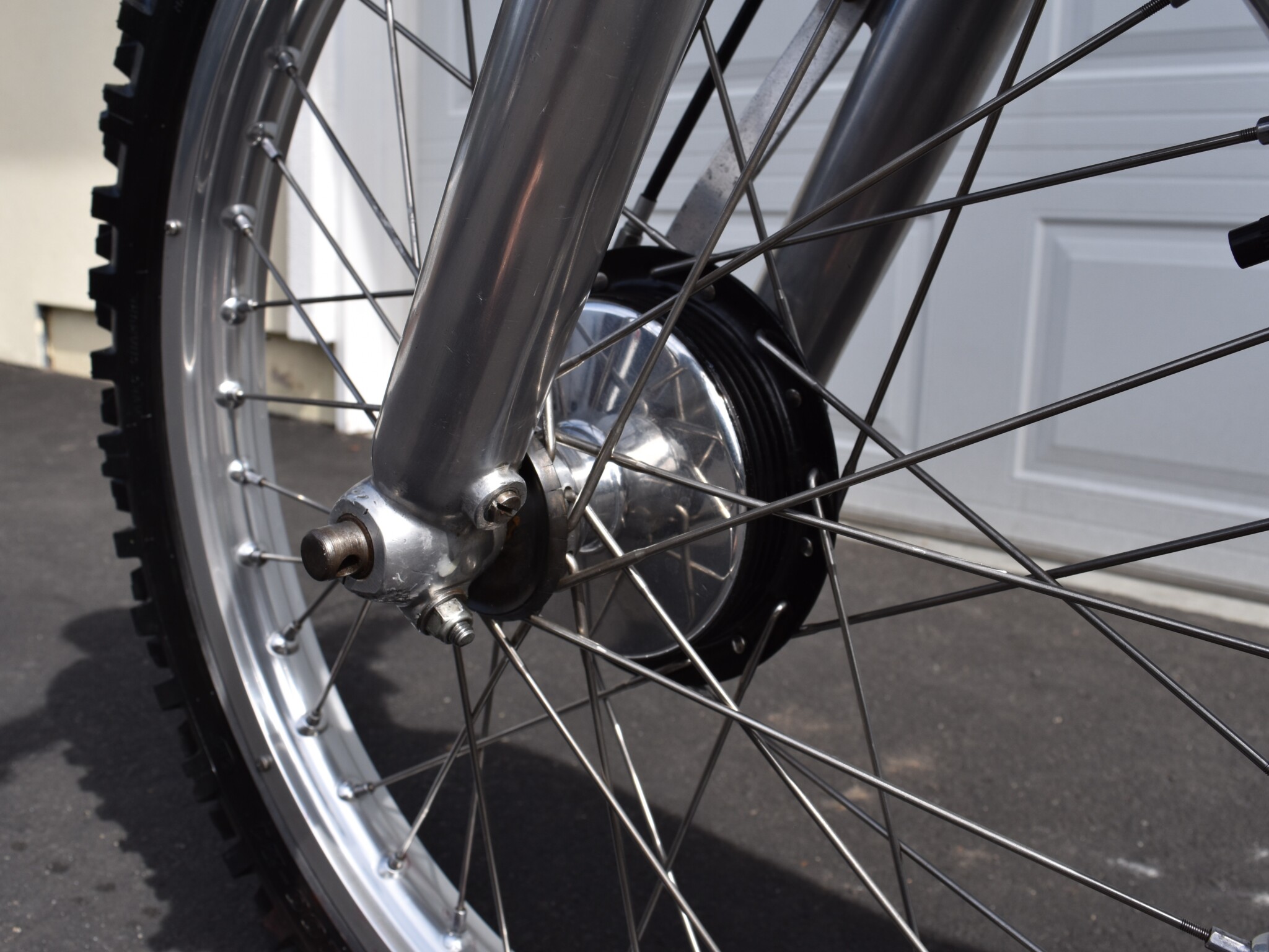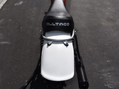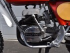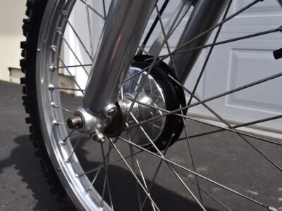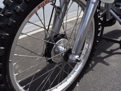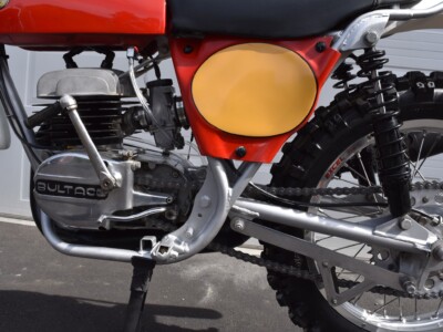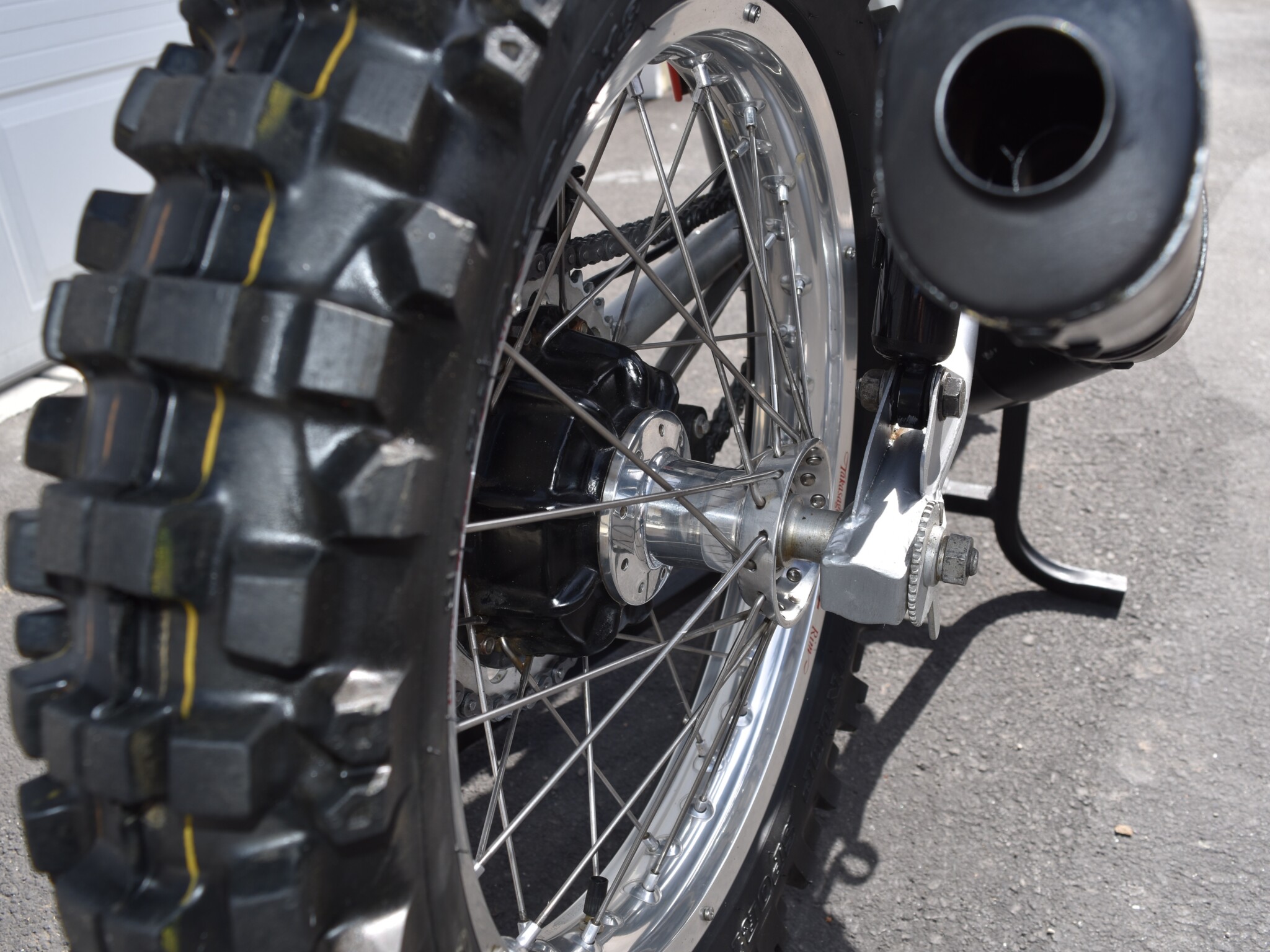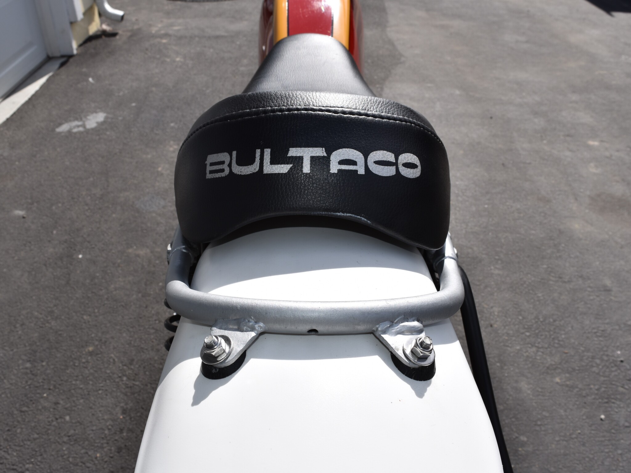 This bike has been beautifully restored with polished cases and polished wheel hubs, and the barrel and the head were restored to new condition.  Takasago Excel rims gleam brightly at the front and rear and are mounted with tires that have minimal use.  The suspension includes Race Tech front fork springs with Gold Valves and dual progressive shocks mounted to the swingarm.  Factory drum brakes are mounted front and rear inside the polished hubs.  The cross-braced handlebars exhibit bright chrome and new grips, and the polished billet aluminum triple tree has a mirror-like shine.  The seller states that he has had about 12 laps, or less than 2 hours of riding time, since the motor was rebuilt.  The 360cc two-stroke is air-cooled with a brand-new electronic ignition system that gets this Bultaco fired up with one kick.  The Amal carburetor is an upgrade from the original factory Amal and delivers improved performance.  The right-side shifter was moved to the left side, and the rear brake is now mounted on the right side.  The bike has been fitted with an FMF exhaust and is said to meet forestry and AHRMA noise and spark requirements.  It comes with a California green sticker for off-road riding.  This bike is ready to race, enjoy off-road, or become a centerpiece in your collection.