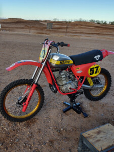 I’m selling my excellent 1979 440 Magnum race bike. It needs nothing! Frame powder coated, less than one hour on complete motor rebuild by Jeff Mullins at Maicowerks. The original Bing, rebuilt by Jeff, and a new Mikuni carb both come with the bike. Talon hubs/Bulldog spokes and Excel rims, new Michelin tires, compression release, cables, complete seat, handlebars, throttle, levers, grips, and the forks and Ohlins shocks were rebuilt by Steve Marpes at Vintage Ohlins. M.O.R. pipe and foot pegs, new plastic from DC Plastics, kick start lever, all stainless steel hardware, chain and sprockets, new brake shoes front and rear hand bedded in, front is 2 fingers. The following billet aluminum parts from Chippy’s in Australia: front and rear brake backing plates, front brake left side conversion with billet torque arm and longer brake lever, rear brake pedal, rear brake torque arm and lever, wingnut, chainguide, case saver for front sprocket, and a steel folding shift lever. Longer 1981 Thor aluminum swing arm. The bike looks and runs like new. It is located in Wyoming, although I do travel to various AHRMA and other races in the West, and I could deliver it. I have more pictures. Thanks! Joe $7000″