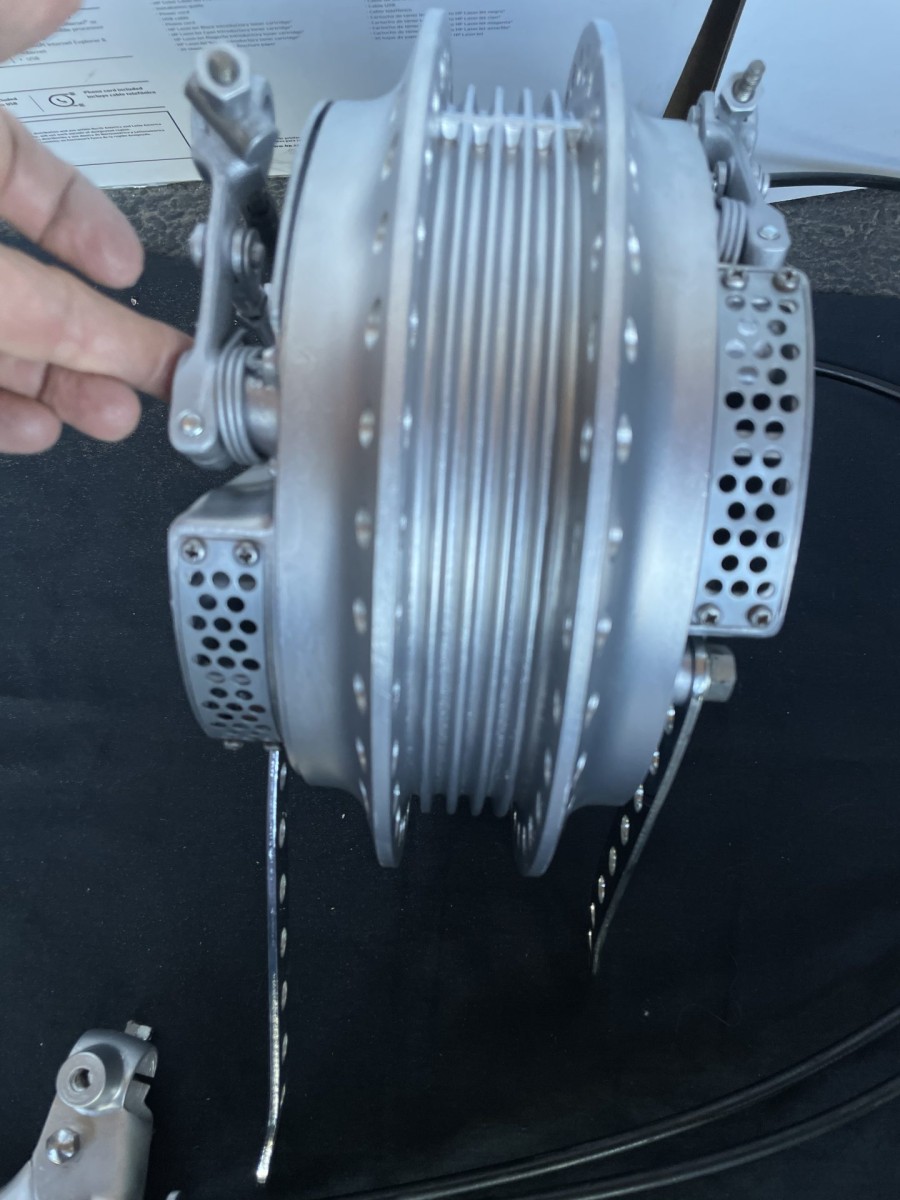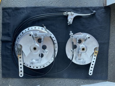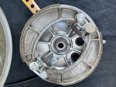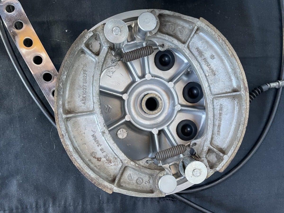 4 Leading Shoe Front Brake Suzuki Water Buffalo.  This was a working brake but on a 350cc (a bit of overkill) so I cleaned it up.  Vapor blasted. Bearings are good as new, cables are good , levers on brake are all good, brake lever for cables on handlebar like new. Shoes and brake surface like new.