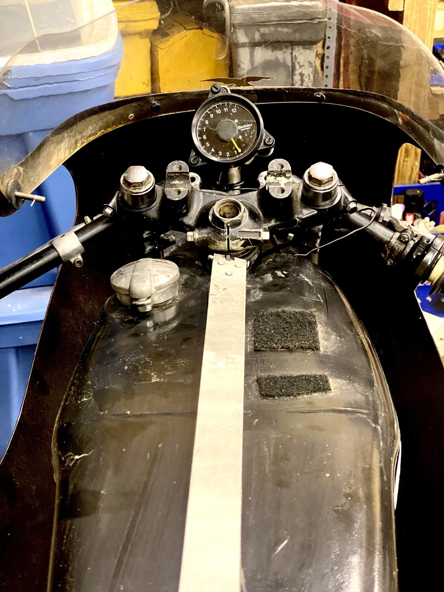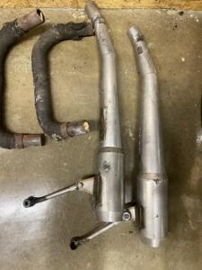 Modified frame, braced for stability. Braced SA, footrest mounts raised for clearance. Alloy rims, T500 2LS brake with Ferodo lining from Vintage Brake with hub welded. braced CB500T forks and triple tree, tapered steering berarings, Full fairing with Alloy front mount and Scitsu tach. Lightweight racing tank and seat, Works Shocks, Clipons, complete with throttle and cable, Adj. Brake lever and cable, Clutch and Cable Full exhaust. Titanium motor mounting fasteners. Comes with alloy stand but will not work with bellypan fitted. This combo has proven to be a superior handling machine and won over 100 races with Wera Vintage and AHRMA. Drop your motor in and go.