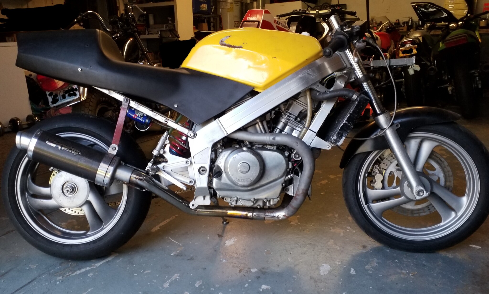 Tires: Bridgestone Battleax. Front: BT39ss 2.5x18 452 Rear: 100/90 78/c 56s Rims: Front: Excel; Rear: DID with heavy spokes Shocks: [...]