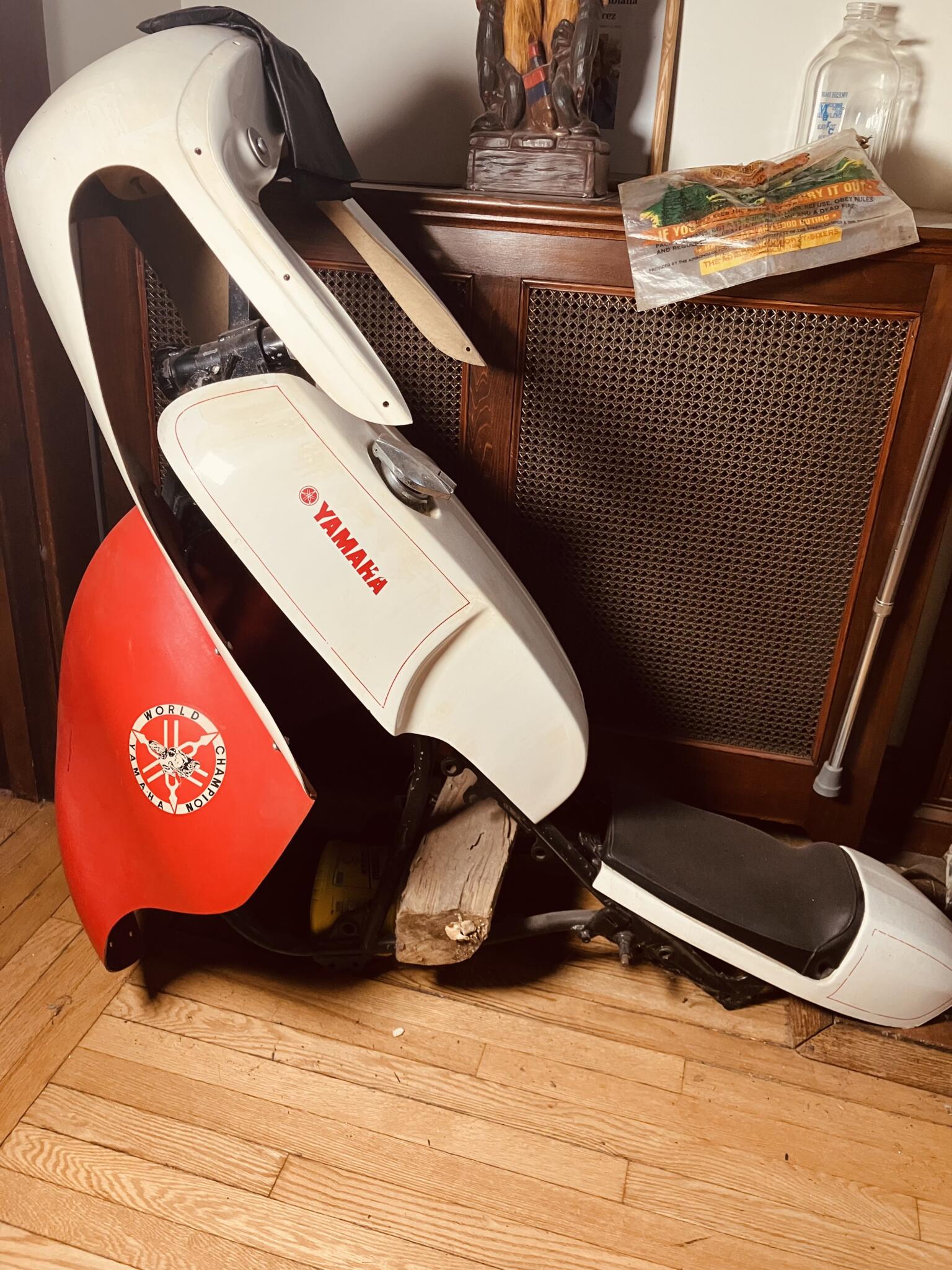 Fiberglas tank, seat, headlight, and lowers for yaMAHa frames, likely R5, RD lineage. Worn red pinstripes and decals on faded [...]