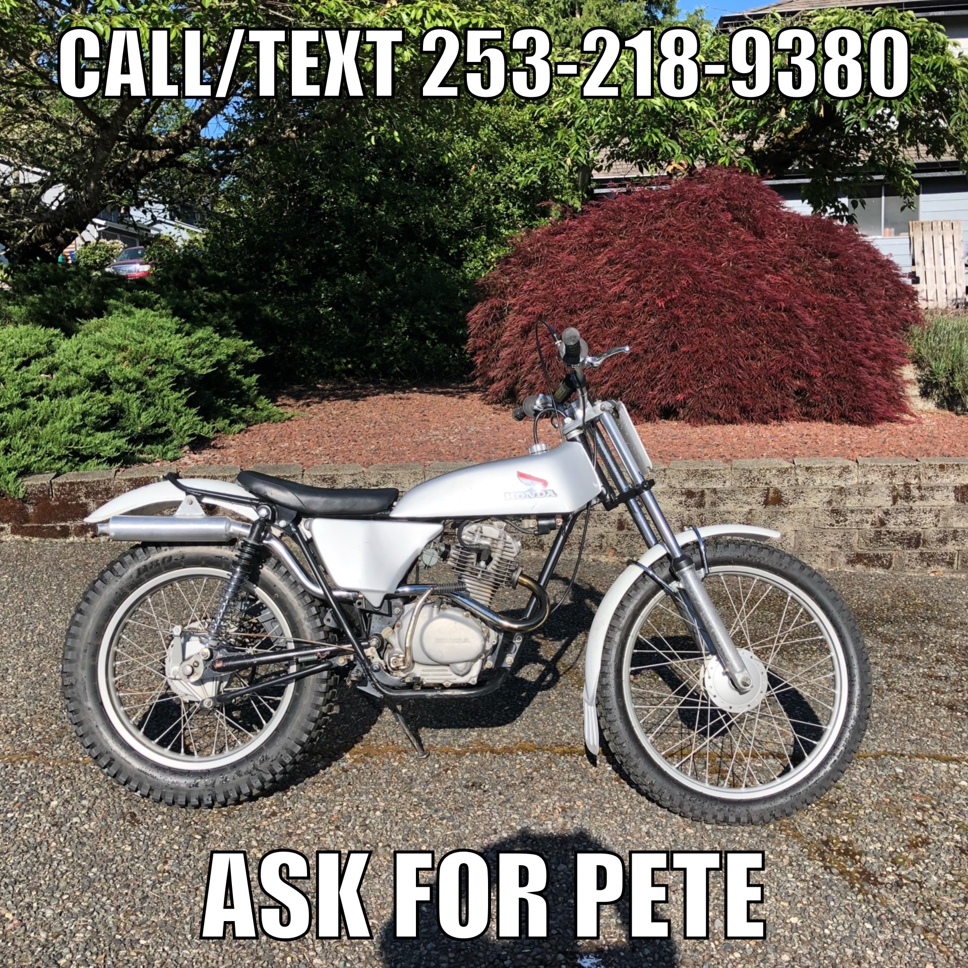 1974 Honda Trials bike, runs well, clean title, Sammy Miller exhaust and seat. $1700 OBO. Call/Text 253-218-9380, ask for Pete.