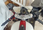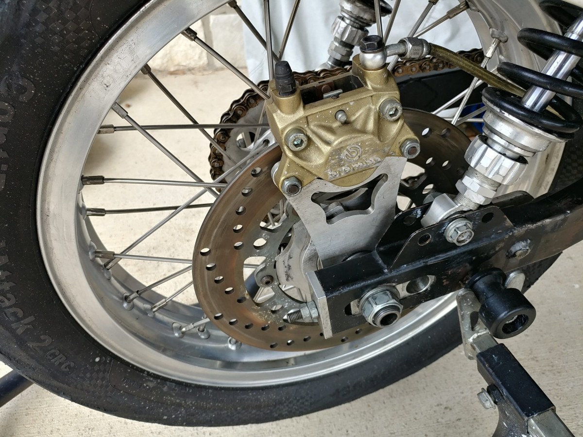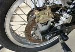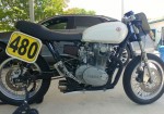 Yamaha XS650 converted to 750 with 24 degree head angle, longer rectangular swing arm, Cheney Engineering QC rear hub, 18 inch wheels, Shell head, 36 mm Amal Concentric MkII carbs, welded crank, Grimeca front and Brembo rear brakes, GS3 Race Tech aluminum adjustable shocks, 38 mm FZR600 forks with Gold Valve.
