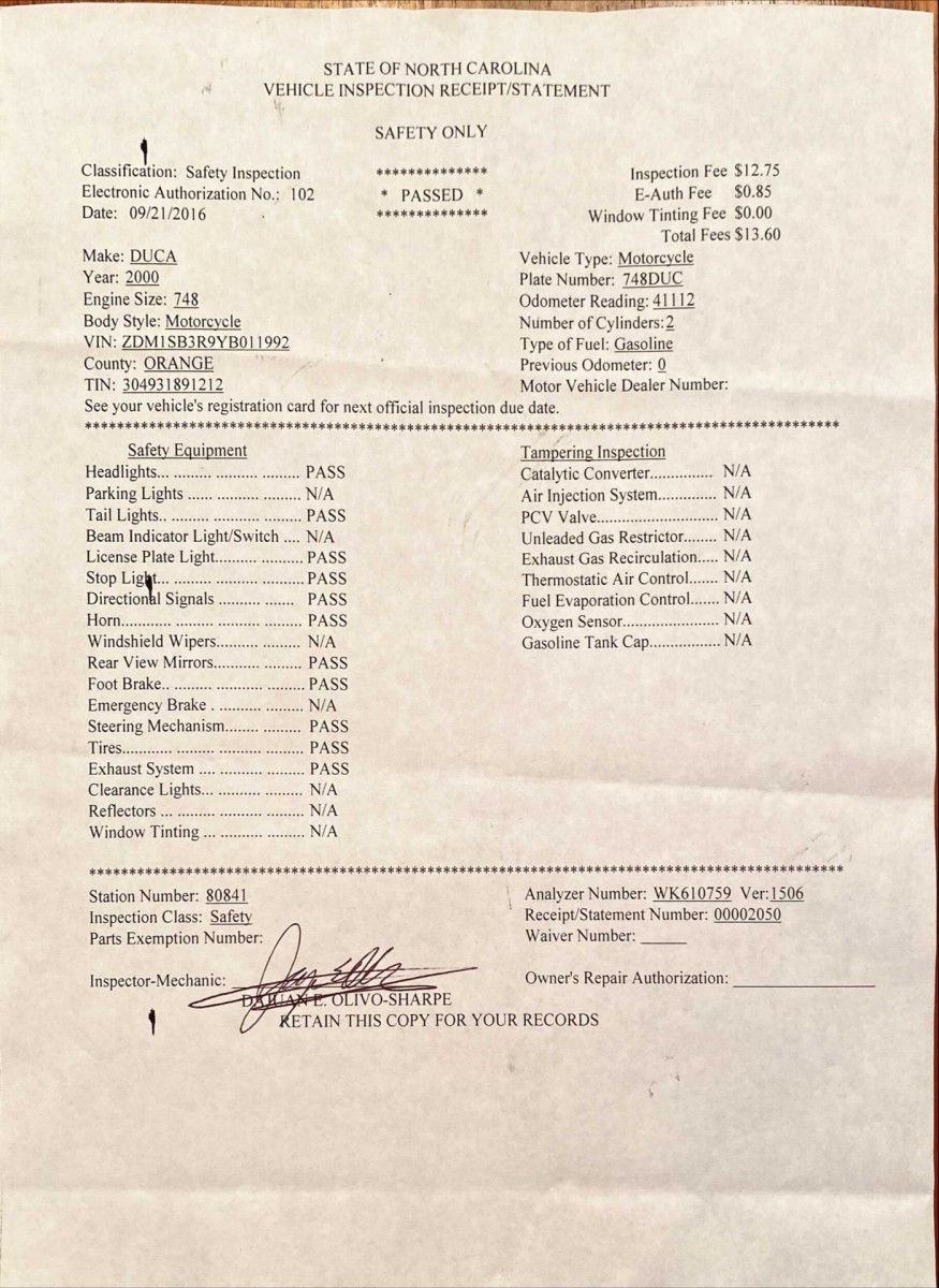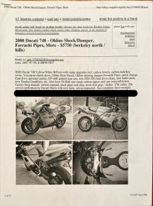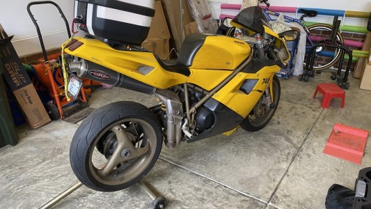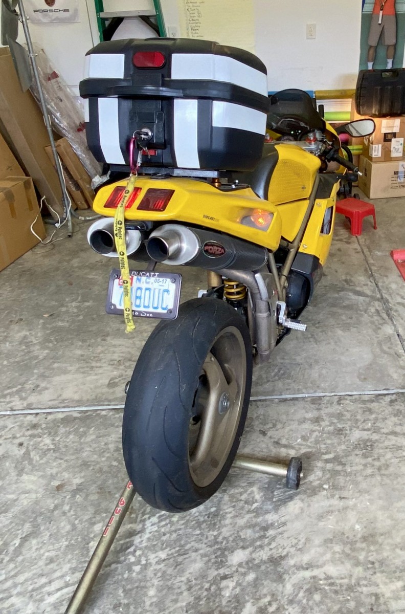 This motorcycle has been ridden reasonably hard and put away wet nearly every occasion, but it rarely let me down in the 14k miles I put on it. Once from a failure of the stock voltage regulator which was replaced with an upgraded unit from Nichols Sport Bike in Milpitas, CA and I have never had this problem again. The second time was several weeks after the timing belts had been replaced by Barnett’s Ducati in Raleigh, NC and one belt slipped because the tension adjuster had been installed incorrectly. They corrected their mistake for free and there was no permanent damage. The bike was as fast as it ever was before the problem.